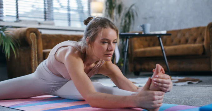 - Сядь на пол, ноги прямые, тело расслаблено. В наклоне коснись руками пальцев ног и останься в таком положении примерно полминуты.