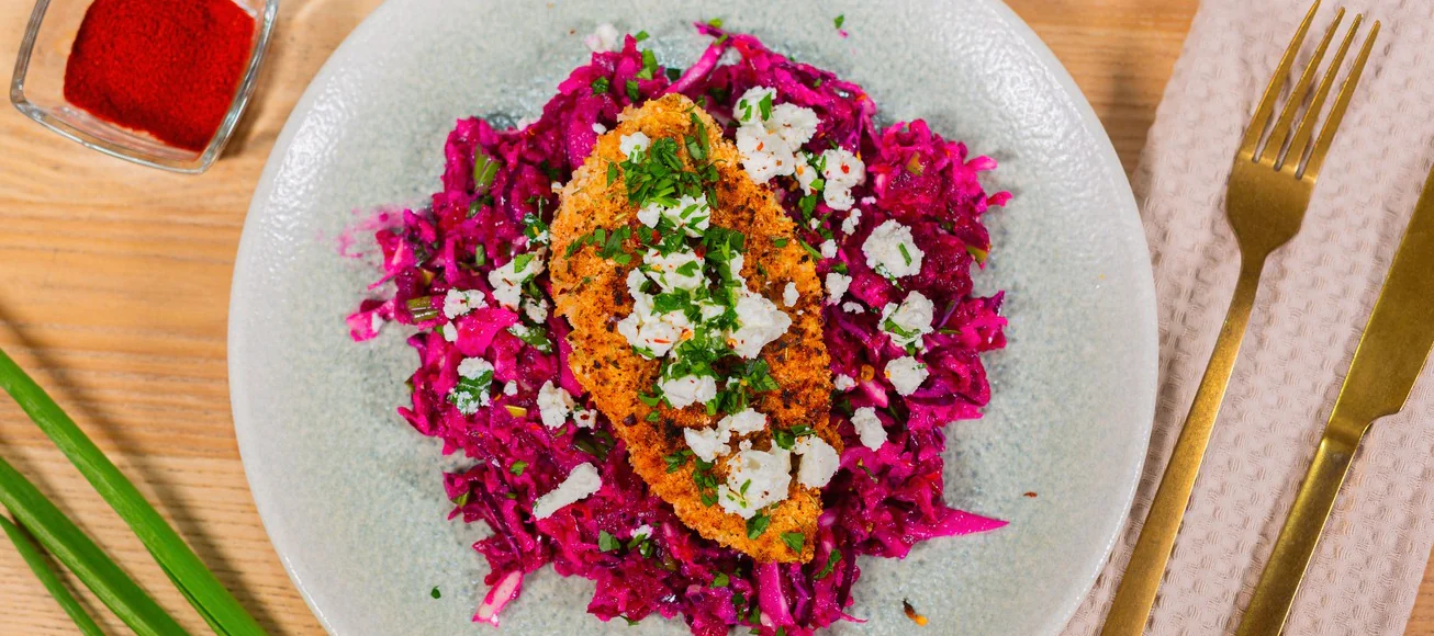Выложите на тарелку яблочно-свекольный салат и хрустящую курицу, посыпьте сыром и свежей петрушкой.
