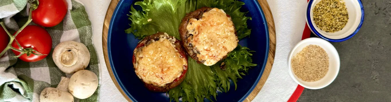 Сверху выложите томаты и обжаренные грибы.