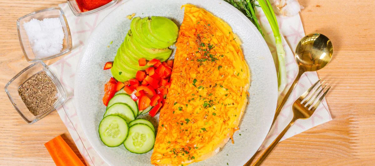 Добавьте на одну половину нарезанный авокадо и аккуратно закройте омлет. Поперчите омлет и подавайте со свежими овощами.