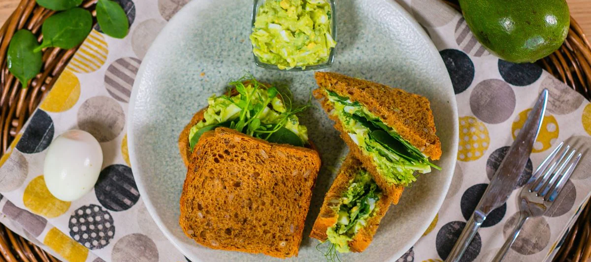 Соберите бутерброд. Намажьте авокадо-яичную смесь на одну сторону хлеба. Сверху выложите листья шпината или ростки гороха, затем второй кусочек хлеба. Разрежьте пополам и наслаждайтесь.
