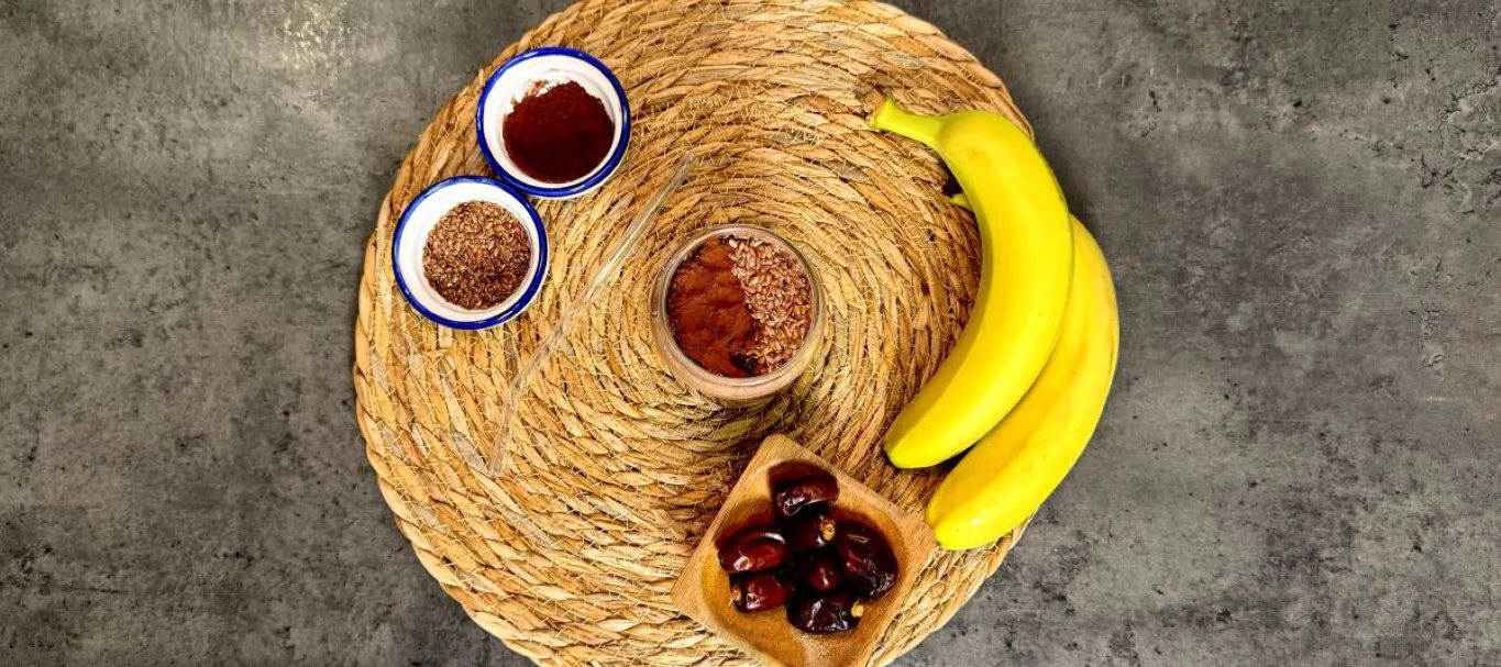 В чашу блендера выложите банан, финик, молотые семена льна и какао-порошок.
