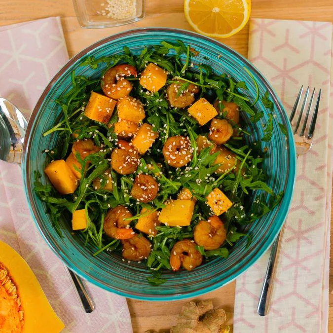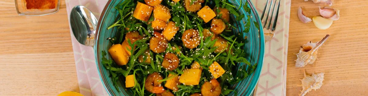 Тёплый салат с креветками и тыквой